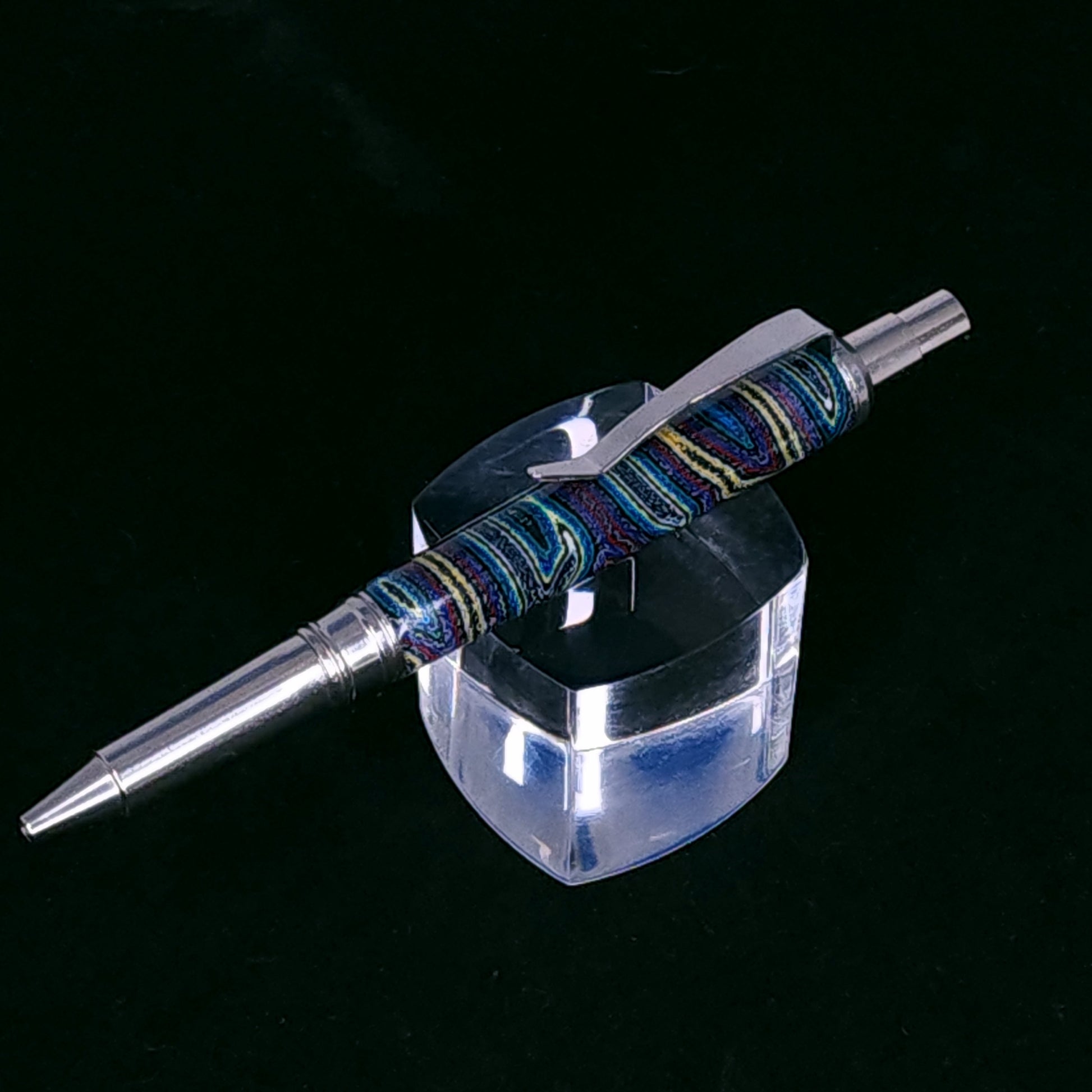 These pens are made of denim and resin. They are pressed at high pressure and cured. They are an interesting material to turn on the lathe, as they fray as you cut into them. This requires many layers of CA glue and a lot of patience.